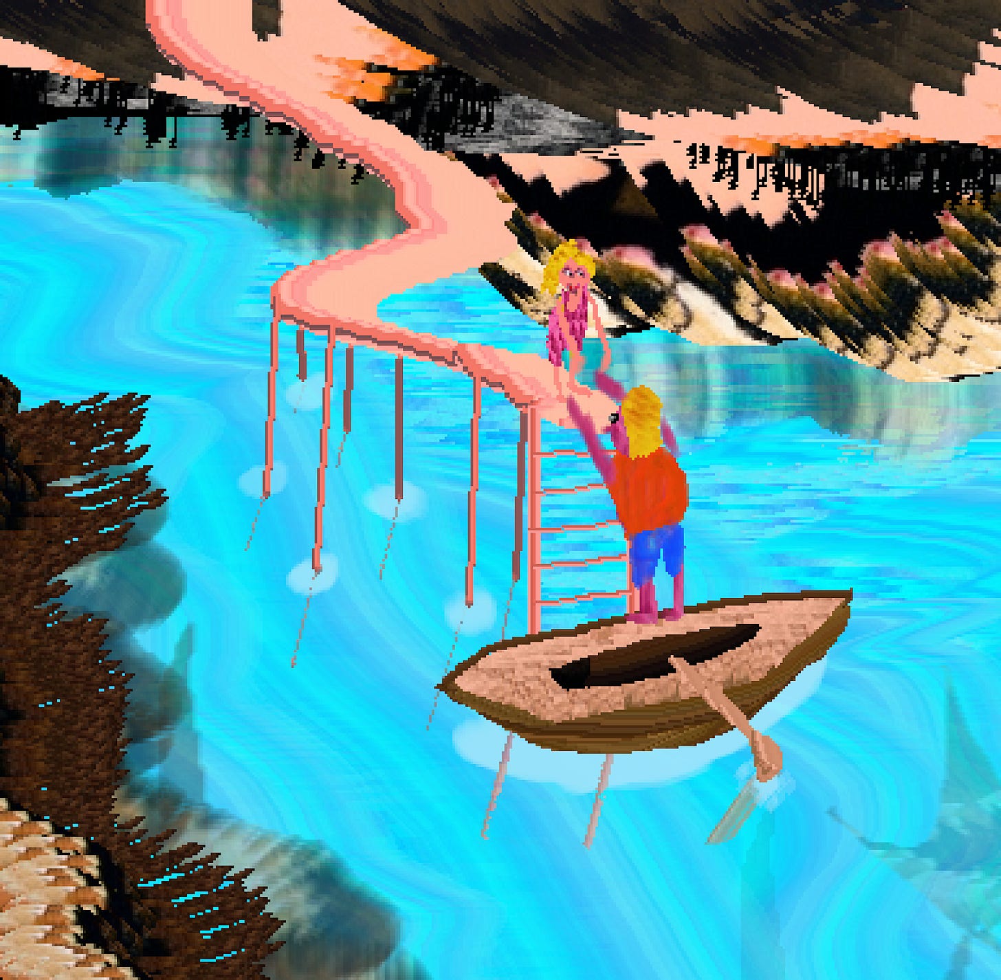 Two people encounter each other in the passage connecting different times in the rainbow, within this drawing, by cutting and changing a part of the background from my previous painting called The Blond Prince. This was the first moment I realized that I could do different things with my own paintings.
